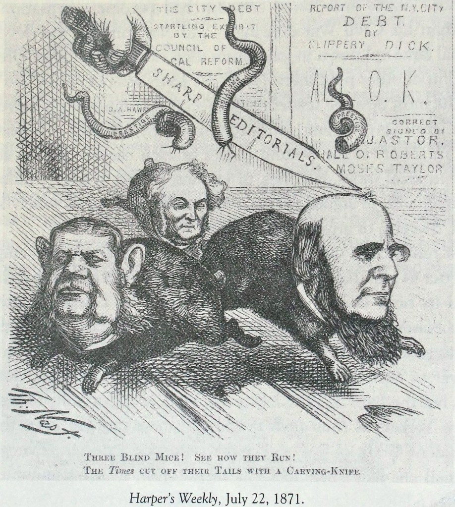 As with his father, John was deeply entrenched in Tammany Hall. His tie to the corrupt political machine was through donations to their campaigns and the enlistment of their help with legislation relating to property and real estate. Corruption was rampant with not only Tammany politics, but also with ruling legislation and even the police force: it was easy to buy what you wanted if you could pay the right price. When concerns of embezzlement and extortion at City Hall surfaced in the late 1860’s, John was named as a member of a committee which, after reviewing the City’s financials for only six hours, attested that all was correct and completed in a faithful manner. It was an attestation that would be blown apart in 1871 when the extent of the pilfering of the City’s Treasury would come to light via an expose in the New York Times. John never took responsibility for anything the committee did or didn’t question during their investigation of the books. The situation, when added to the lengths the Astors went in preventing the northern spread of the population in the City and their longstanding stranglehold of valuable property, further cemented the Astor name to be synonymous with ruthlessness and callousness.